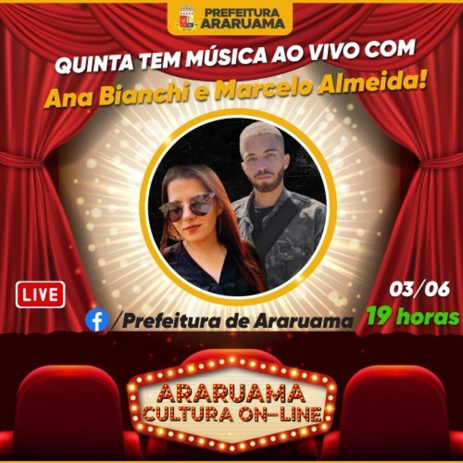 Juntos, os dois prometem um show com repertório variado. Vai ser nessa quinta-feira, 03, a partir das 19h, pela página do Facebook da Prefeitura.