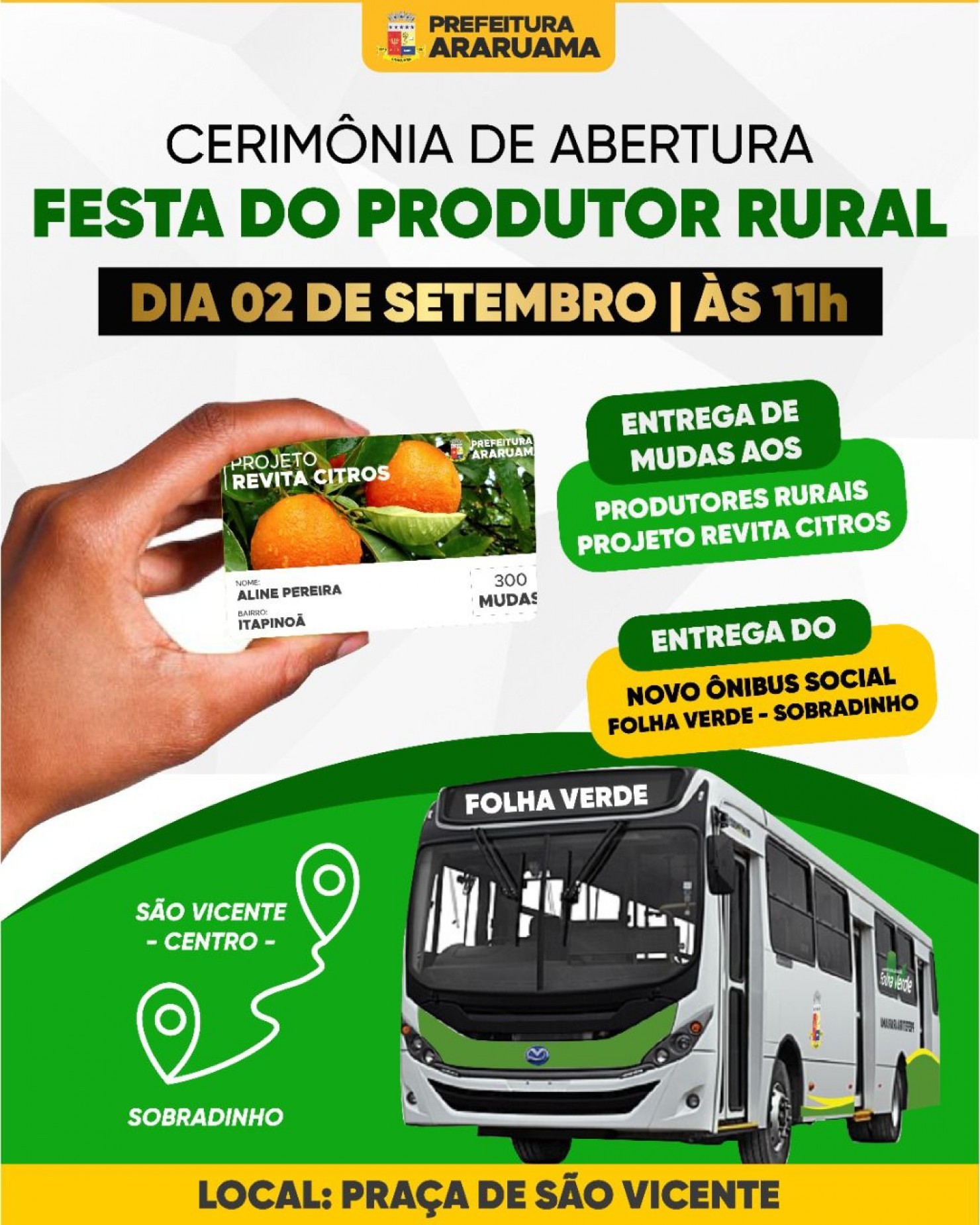 Por isso, na sexta-feira, 02, durante a cerimônia de abertura da festa a Prefeitura vai fazer a entrega do “ônibus social Folha Verde”, que vai fazer a rota Sobradinho – São Vicente-Centro; totalmente gratuito, como forma de incentivo aos trabalhadores da agricultura familiar.