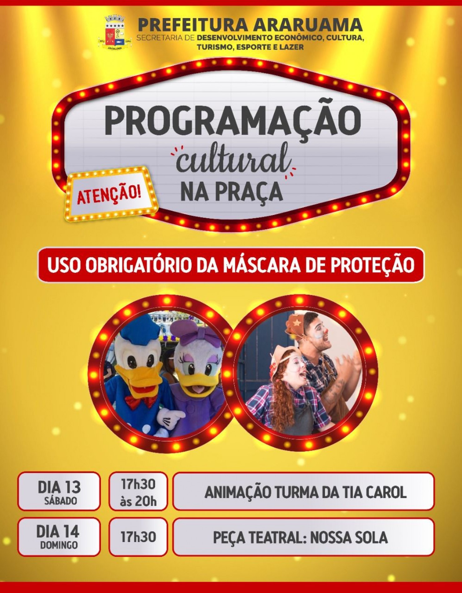 No sábado, 13, vai ter “Animação com a turma da Tia Carol”, entre 17h30 e 20h.