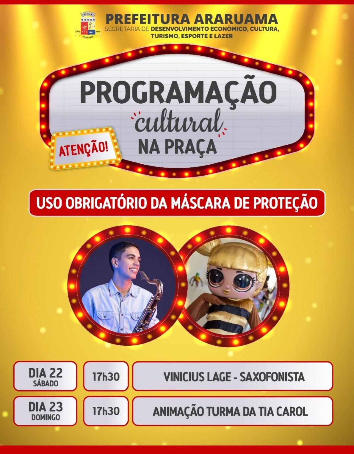 Importante ressaltar que no local será obrigatório o uso de máscara de proteção e distanciamento social.