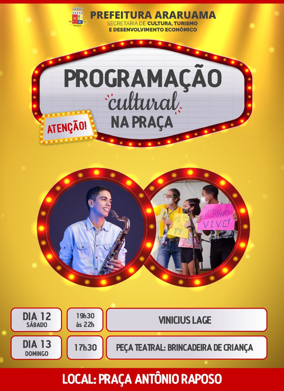 No domingo, 13, vai acontecer a peça teatral “Brincadeira de criança”, a partir das 17h30.