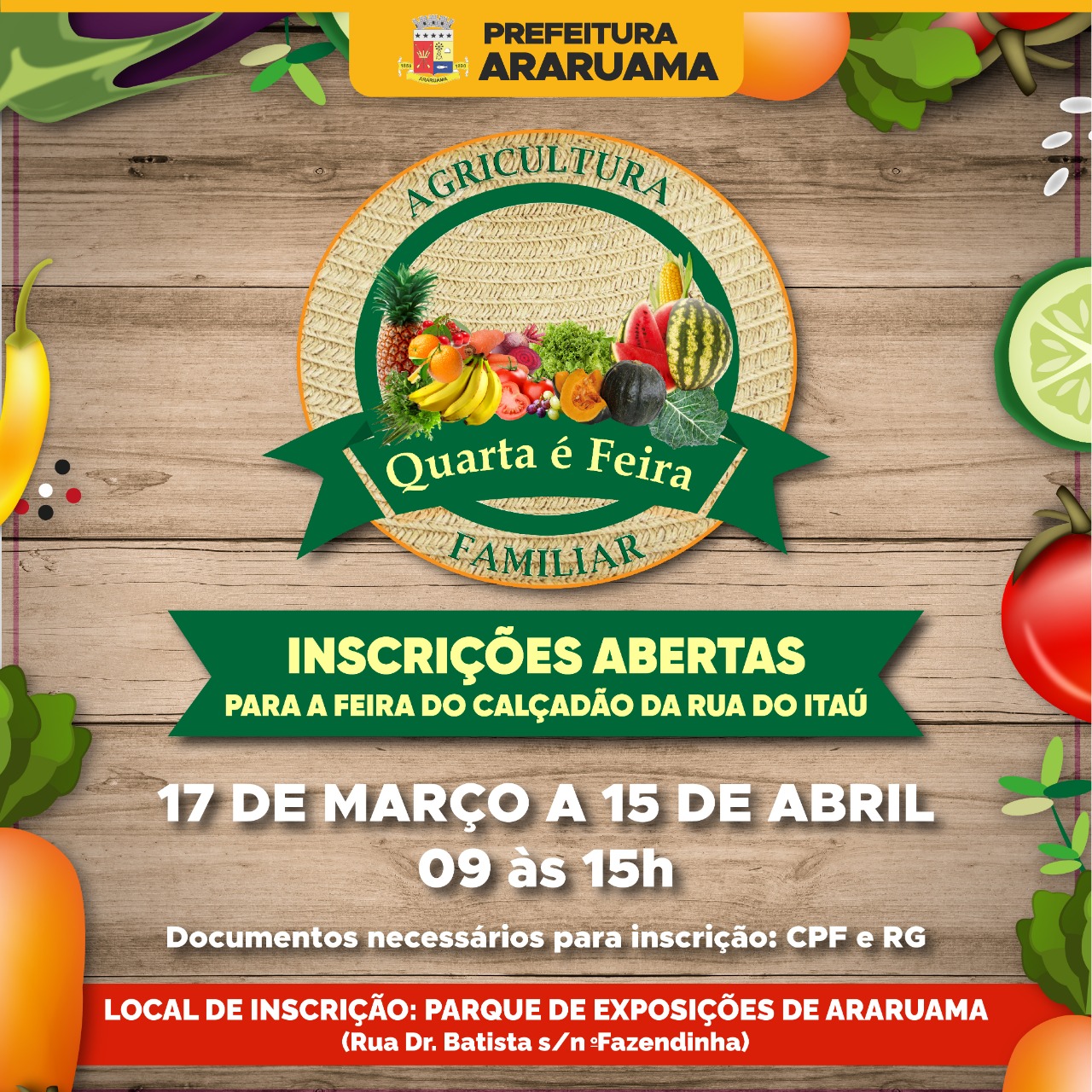 Uma oportunidade para aumentar a renda do pequeno agricultor. A Prefeitura, por meio da Secretaria de Ambiente, Agricultura, Abastecimento e Pesca, abriu as inscrições para os produtores que queiram comercializar seus produtos do campo na tradicional Feira, que agora acontece no calçadão da Rua do Itaú, por meio do projeto: Quarta é Feira na Praça.