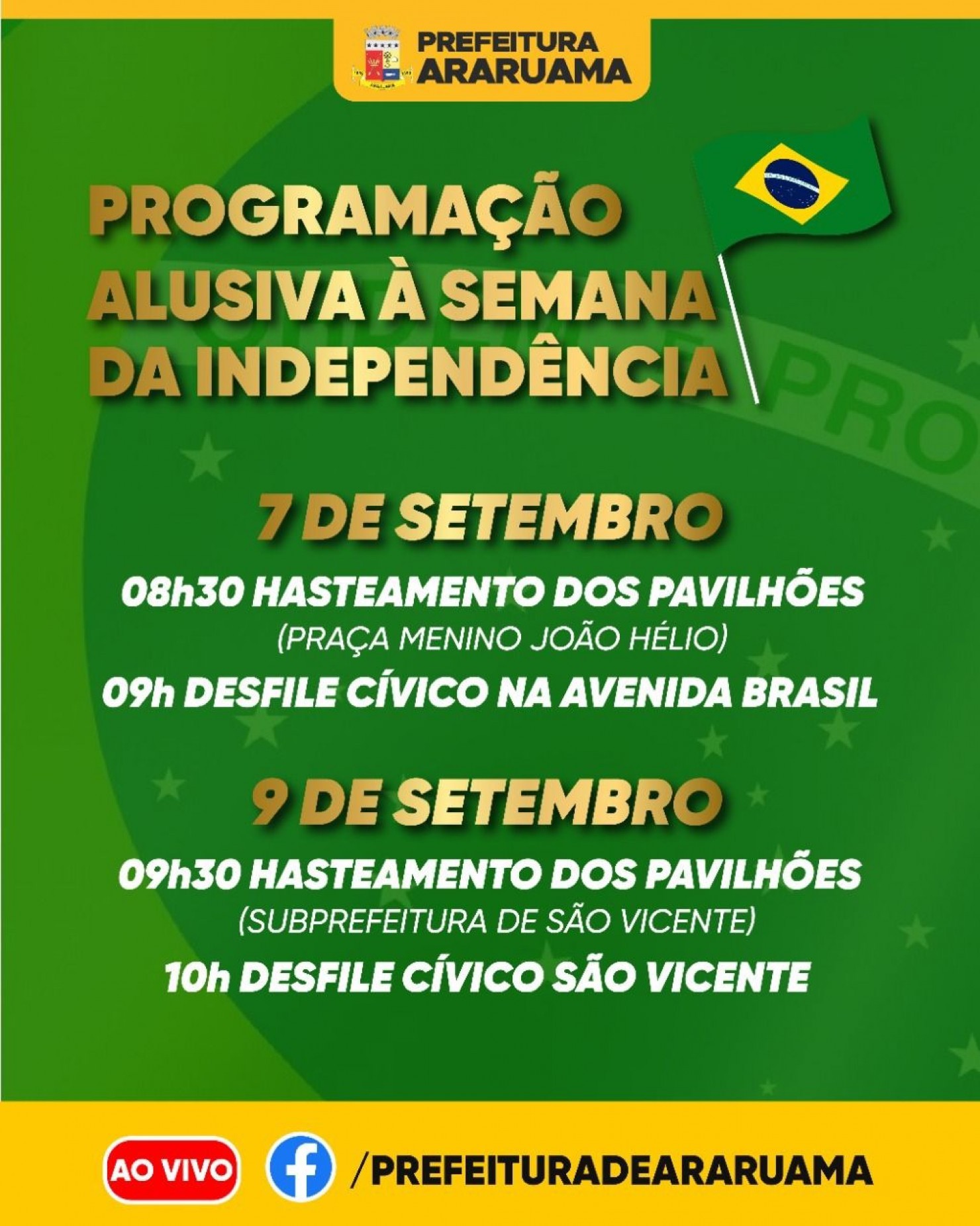 Quem não puder comparecer presencialmente, vai poder acompanhar os eventos da Semana da Independência de maneira on-line, pelo Facebook da Prefeitura de Araruama.
