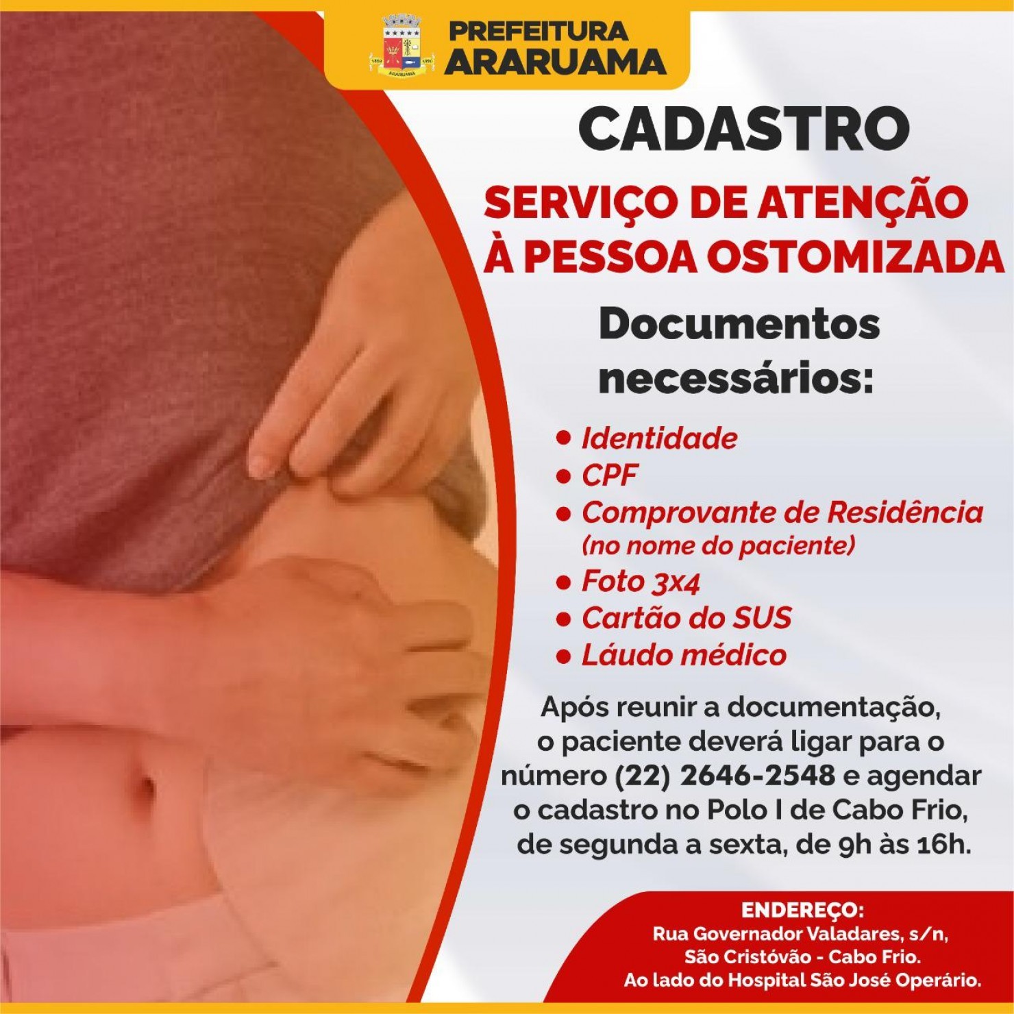 O Polo I de Atenção às Pessoas Ostomizadas fica na Rua Governador Valadares, sem número, bairro São Cristóvão, ao lado do Hospital São José Operário. Cabo Frio- RJ.