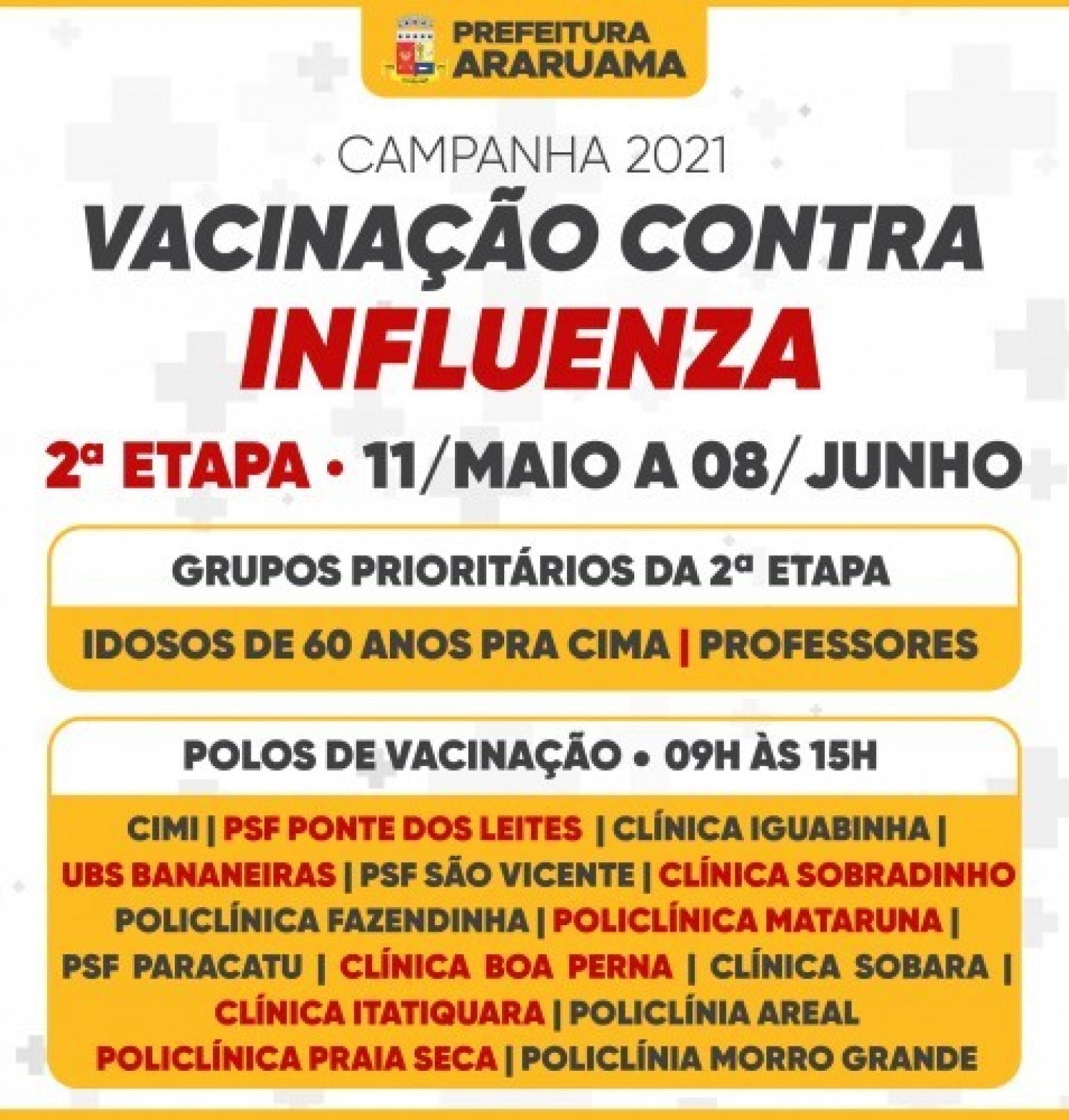 A vacinação contra a gripe acontece das 09h às 15h, em 15 polos, descritos no calendário abaixo. Acompanhe.