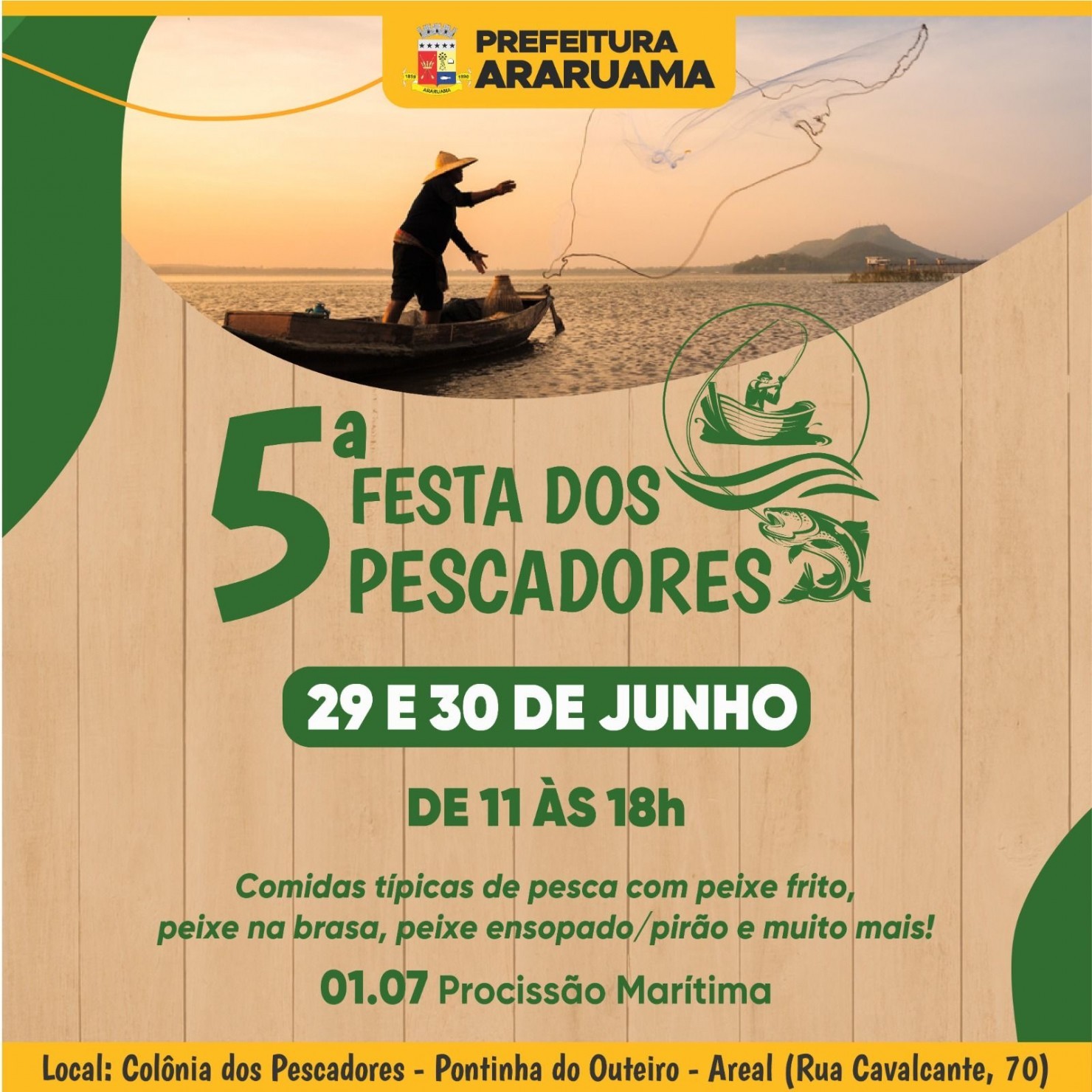 O evento vai acontecer nos dias 29 e 30 de junho, na sede da Colônia dos Pescadores Z-28, localizada na Rua Cavalcante, nº 70, no bairro Pontinha do Outeiro (Rancho dos Pescadores), das 11h às 18h.