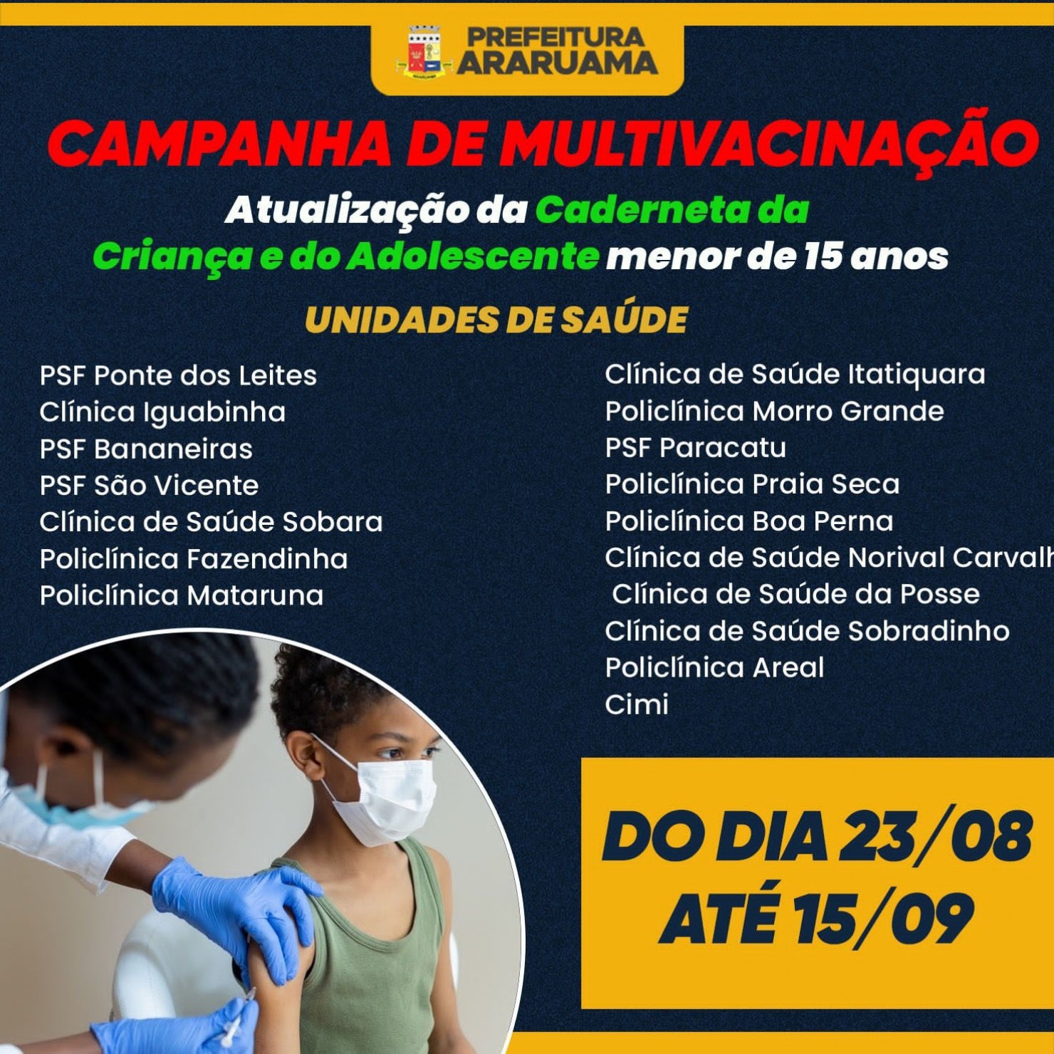 A Prefeitura de Araruama, por meio da Secretaria de Saúde, vai dar início amanhã, dia 23, à Campanha de Multivacinação para atualização da caderneta de vacinação da criança e do adolescente menor de 15 anos.