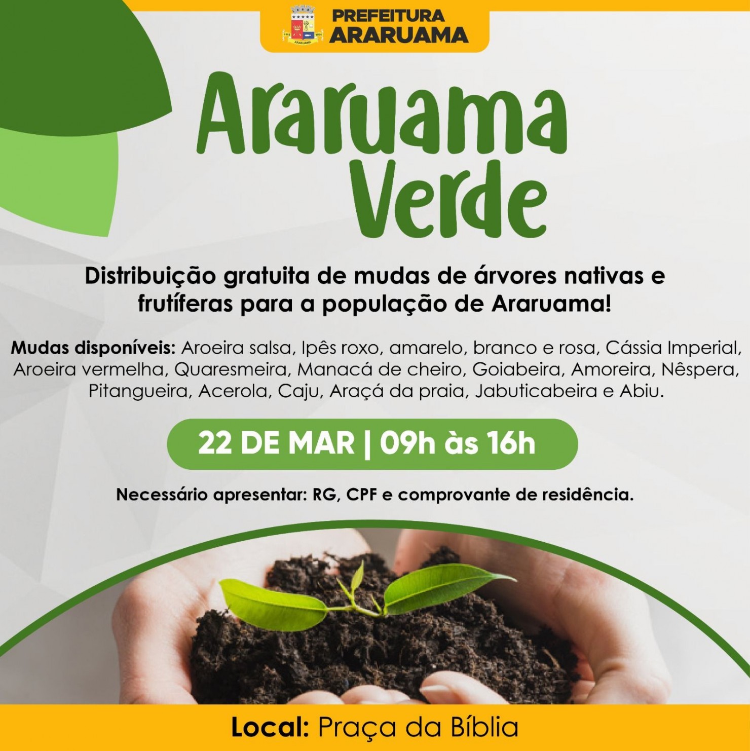 Cada morador terá direito de levar uma muda pra casa. Para isso, será preciso apresentar RG, CPF e Comprovante de endereço.