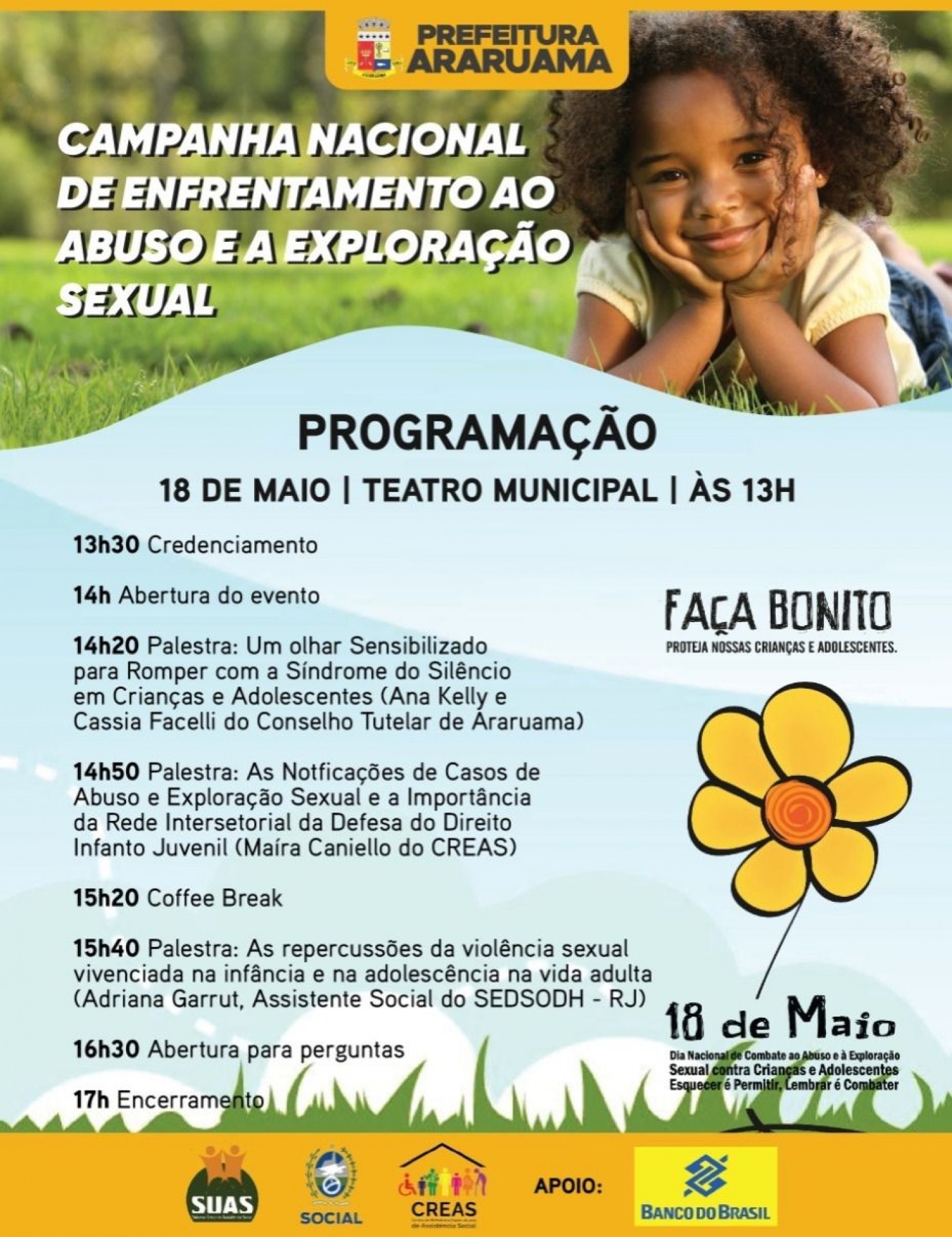 O encontro será realizado no Teatro Municipal, das 13h30 às 17h. Os objetivos principais são: convocar toda a sociedade araruamense para o compromisso de proteger as crianças e adolescentes dos casos de abuso e exploração sexual , mostrar a importância de denunciar esses crimes e, ainda, divulgar o trabalho da rede de Proteção Social Básica e Especial do município.