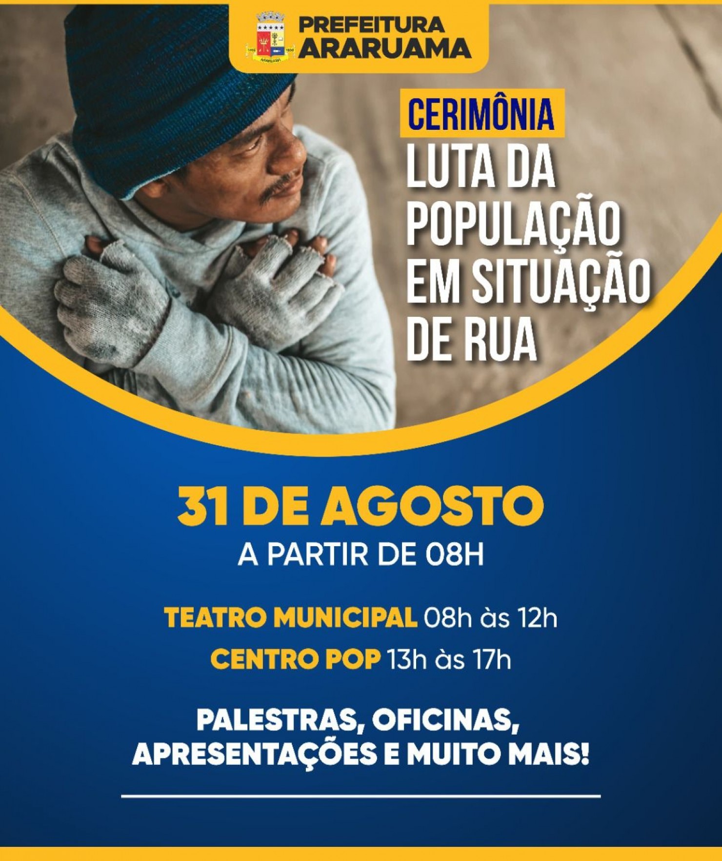 Estão previstos o credenciamento dos participantes, abertura do evento com apresentações musicais, exposição do trabalho que é realizado hoje no Centro Pop (Centro de Referência Especializado para População em Situação de Rua de Araruama) e em seguida, as palestras.