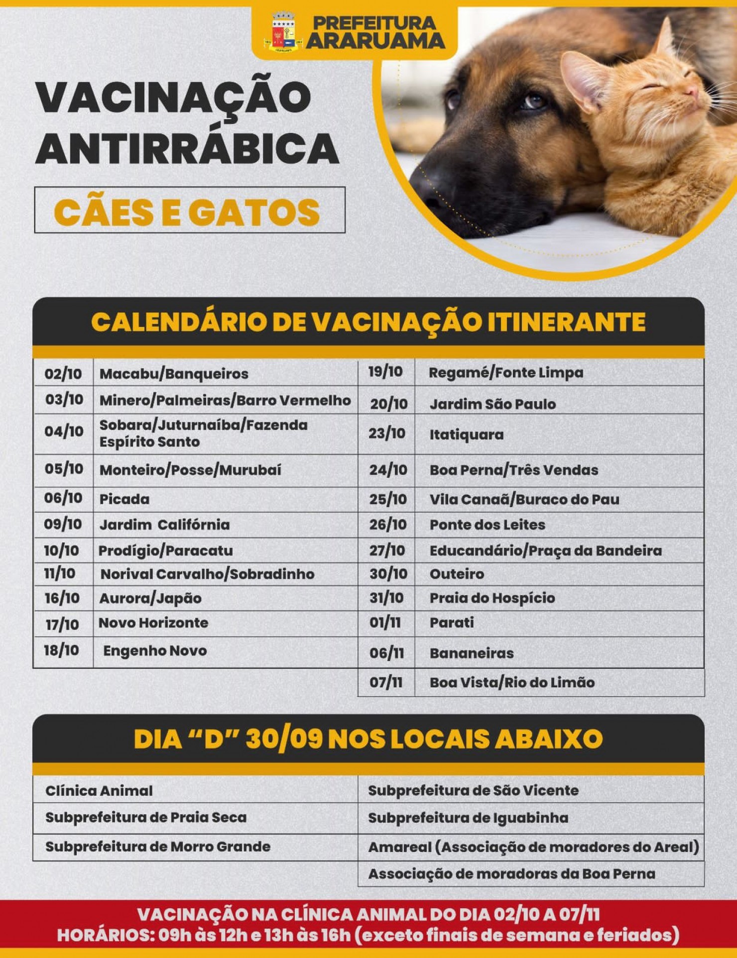 Para abranger um número cada vez maior de cães e gatos, haverá a campanha itinerante nos bairros, o tradicional dia D (30 de setembro) e um local fixo para a vacinação contra a raiva.