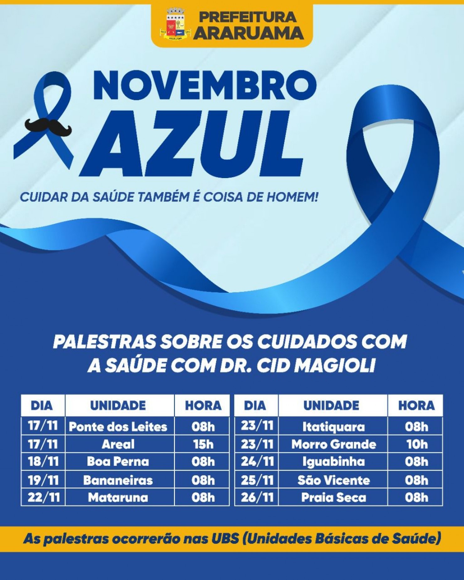 Portanto, entre os dias 17 e 26 de novembro, o médico doutor Cid Magioli, vai realizar as palestras e levar todo esse conhecimento ao público em dez unidades de saúde de Araruama.