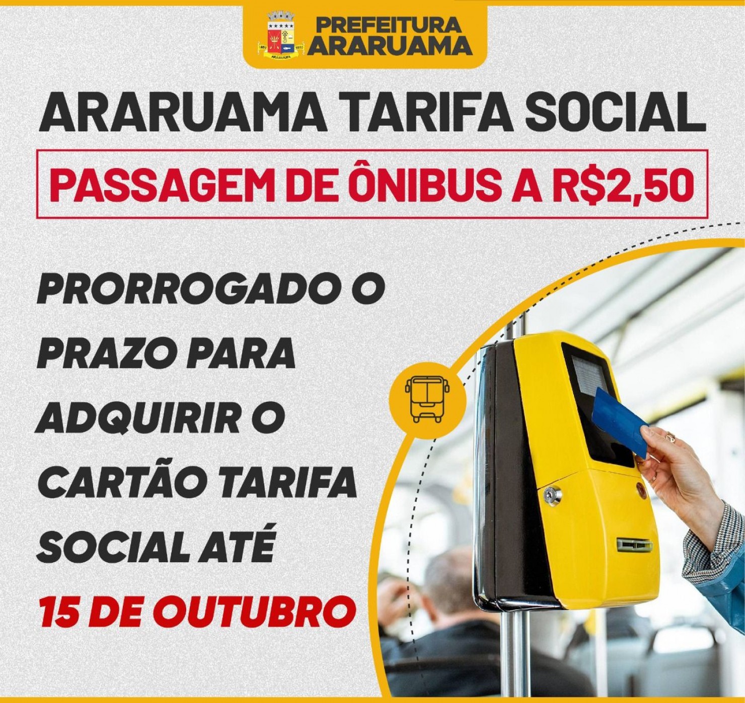 Agora, foi prorrogado até o dia 15 de outubro o prazo para o morador adquirir o cartão “Araruama Tarifa Social”, que dá direito à passagem de ônibus a R$2,50.