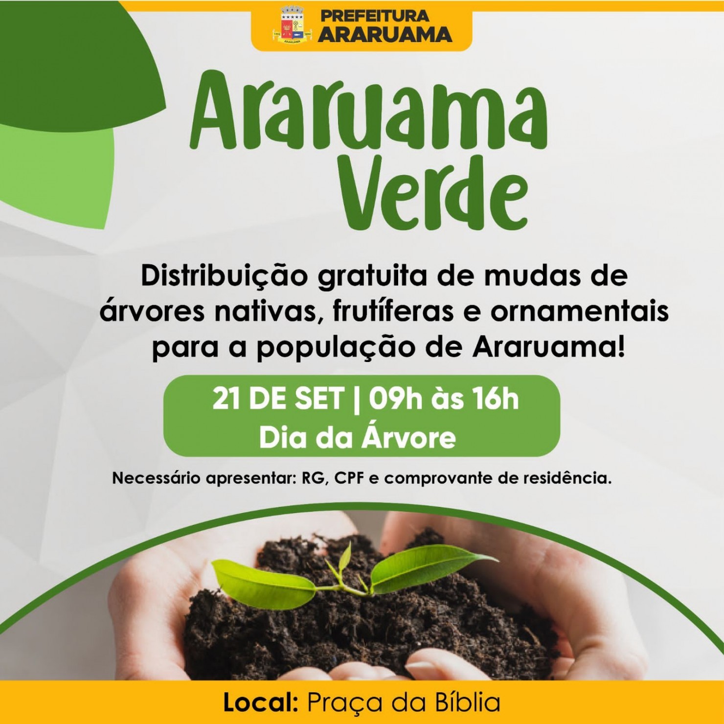 Por meio do projeto Araruama Verde, serão distribuídas gratuitamente aos moradores cerca de 600 mudas de plantas, como pau-brasil, ipê amarelo, ipê branco, pau-ferro... e árvores frutíferas, como acerola, jaboticaba, caju, pitanga e amora.