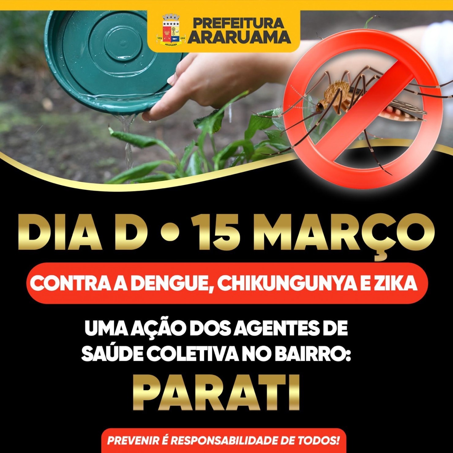 A Prefeitura, por meio da Secretaria de Saúde e da Secretaria de Obras , vai realizar mais um Dia D contra a dengue no município. Dessa vez a ação será no bairro Parati, nessa sexta-feira, 15, entre 09h e 16h.