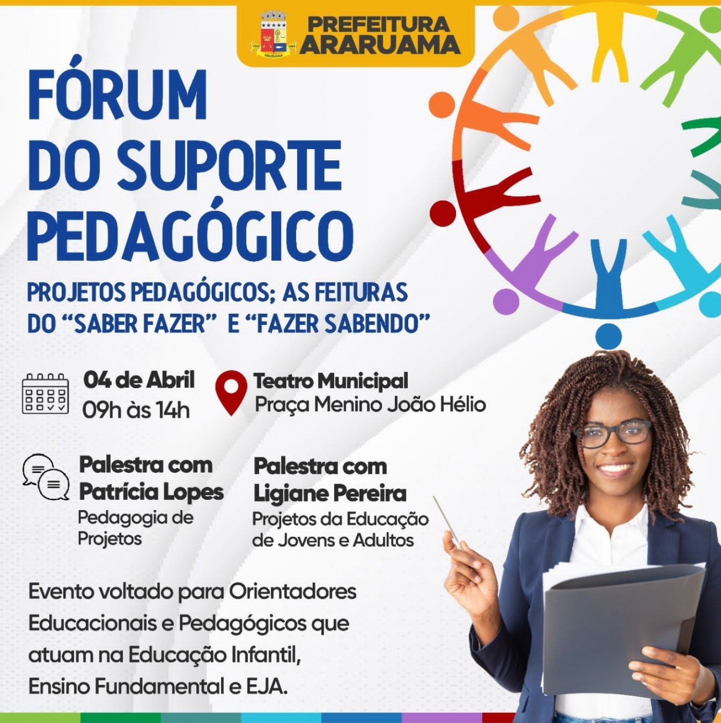 Com o tema: “Projetos pedagógicos - as feituras do saber fazer e fazer sabendo”, o Fórum tem o objetivo de promover o estudo, reflexão e discussão relacionados ao saber pedagógico e educacional dos orientadores que atuam na Educação Infantil, Ensino Fundamental e Eja de Araruama.