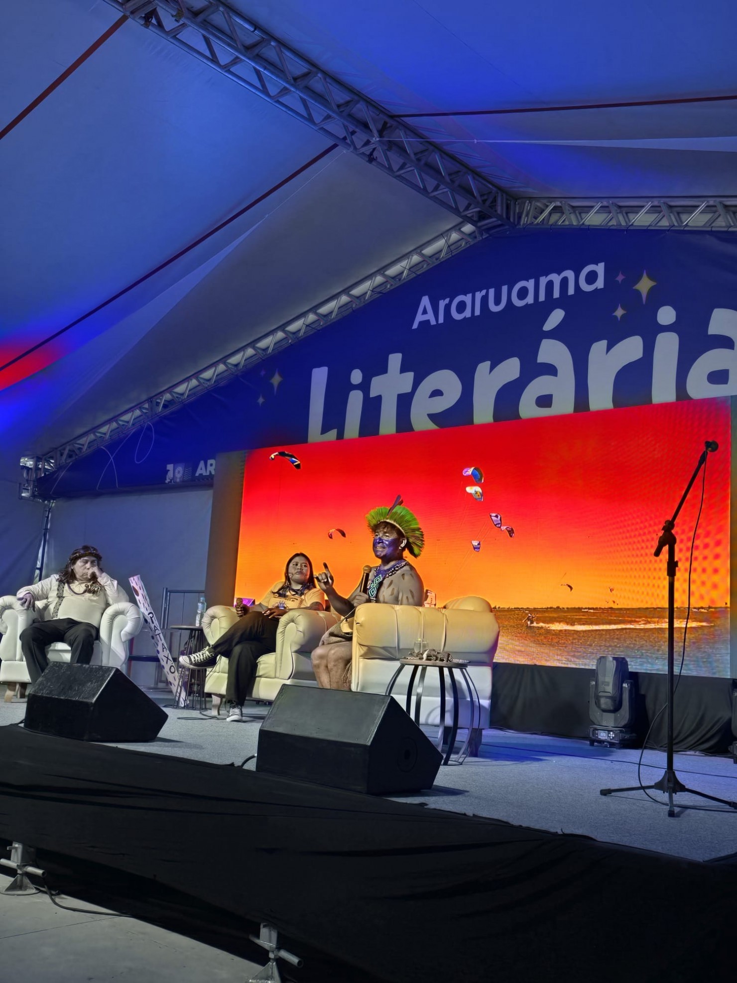 A primeira palestra da edição 2025 da Araruama Literária começou com uma roda de conversa com com Daniel Munduruku e Arassari Pataxó, com o tema “Identidade e território: povos silenciados pelo colonialismo/eurocentrismo”, mediada por Thayná Álvares.
