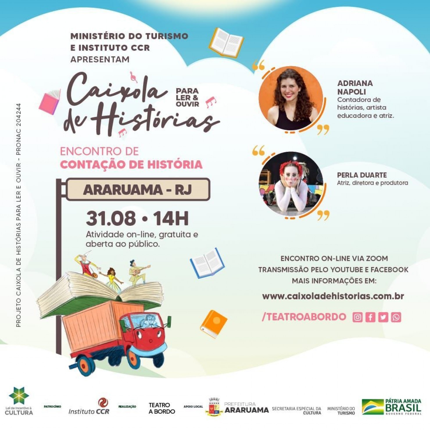 O teatro virtual, da companhia Teatro a Bordo, vai acontecer nessa terça-feira, 31, às 14h, por meio da plataforma zoom, com transmissão ao vivo no YouTube e na página do Facebook da Companhia. “Teatro a Bordo “.