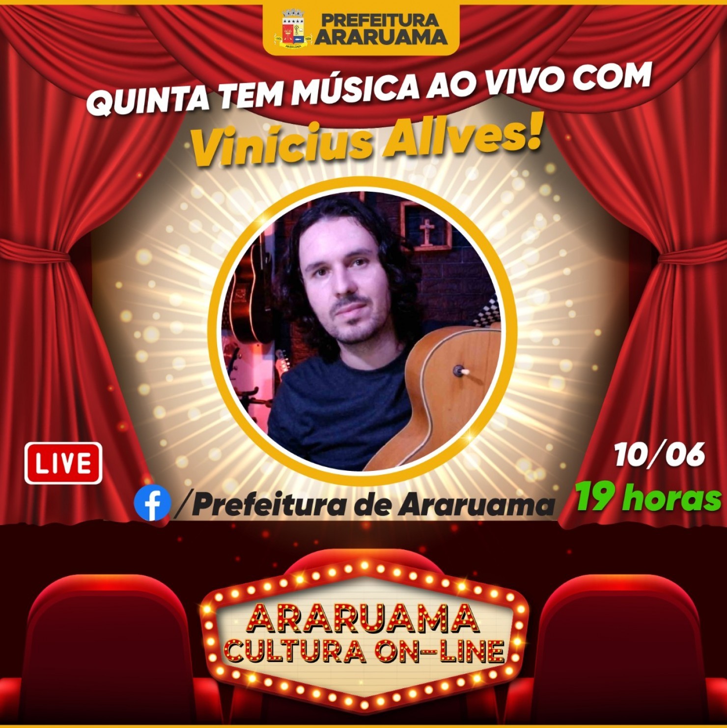 Muito Pop e Rock no palco do Araruama Cultura On-line. Nessa quinta-feira, 10, quem vai se apresentar é o músico Vinícius Allves.